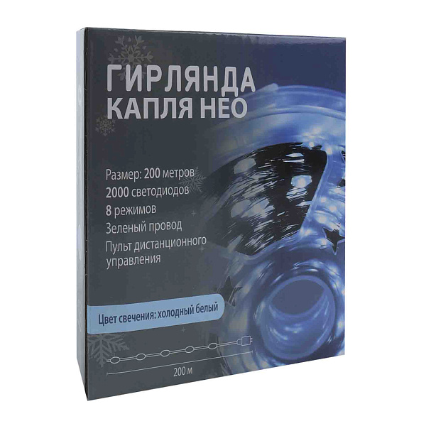 Электрогирлянда LED «Капля» длиной 200 метров представляет собой светодиодную ленту с 2000 лампами, излучающими холодный белый свет. Гирлянда оснащена зеленым проводом, что делает ее менее заметной при декорировании помещений, елок и окон. Устройство поддерживает 8 различных режимов свечения, что позволяет создавать разнообразные световые эффекты.
