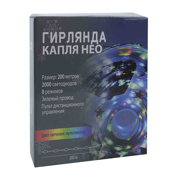 Электрогирлянда LED «Капля» длиной 200 метров представляет собой светодиодную ленту с 2000 лампами, излучающими разноцветный цвет. Гирлянда оснащена зеленым проводом, что делает ее менее заметной при декорировании помещений, елок и окон. Устройство поддерживает 8 различных режимов свечения, что позволяет создавать разнообразные световые эффекты.