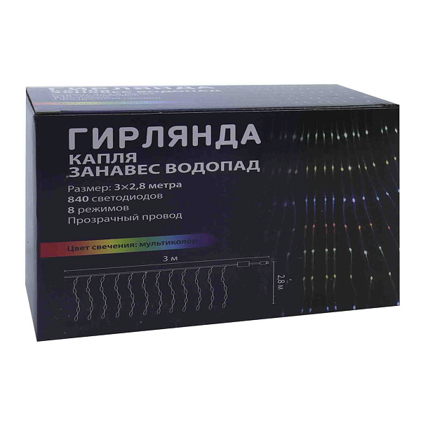 Электрогирлянда LED «Капля» в виде водопада представляет собой декоративное украшение для интерьера с эффектом вертикального падения капель света. Модель выполнена с прозрачным проводом и оснащена 813 светодиодами, которые мерцают разными цветами, создавая яркую и насыщенную цветовую динамику. Размер гирлянды составляет 3 метра в ширину и 2,7 метра в высоту, что позволяет использовать ее для украшения окон, витрин и других элементов интерьера.