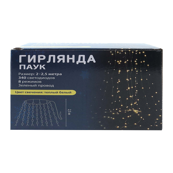 Электрогирлянда LED «Паук» высотой 2,5 метра предназначена для использования в помещениях и декоративного оформления елок и интерьера. В гирлянде 340 светодиодов с теплым белым свечением, расположенных на зеленом проводе, что обеспечивает естественный и аккуратный вид. Модель поддерживает 8 режимов свечения, позволяя создавать разнообразные световые эффекты.