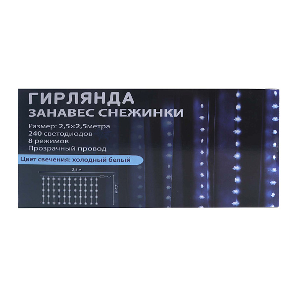 Электрогирлянда LED «Снежини» в виде занавеса представляет собой декоративное украшение для интерьера с эффектом вертикального падения снежинок. Модель выполнена с прозрачным проводом и оснащена 240 светодиодами, которые мерцают холодным белым светом, создавая яркую и насыщенную цветовую динамику. Размер гирлянды составляет 2.5 метра в ширину и 2,5 метра в высоту, что позволяет использовать ее для украшения окон, витрин и других элементов интерьера.