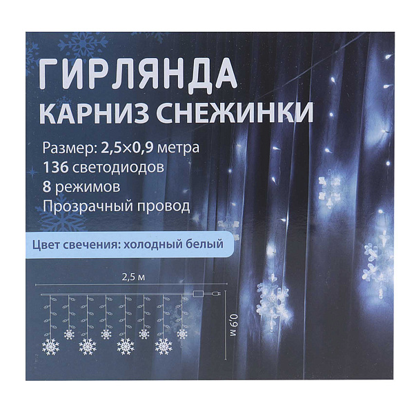 Электрогирлянда LED Карниз снежинки белый холодный свет 8режимов 2,5х0,9м