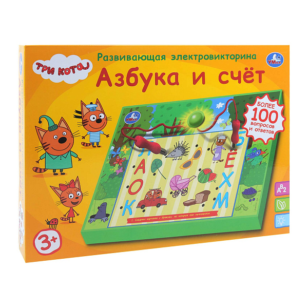 Развивающая электровикторина «Азбука и счет» поможет малышам легко справиться с изучением букв, цифр, цветов и фигур. В процессе игры ребенок научится читать слоги и целые слова, сможет ориентироваться на плоскости и решать несложные математические примеры. Для проверки полученных знаний малышам нужно ответить на вопросы по 8 темам вместе с героями мультфильма «Три кота». Яркие иллюстрации, световые и звуковые эффекты сделают обучение увлекательнее. Всего: 650 картинок, 350 заданий.