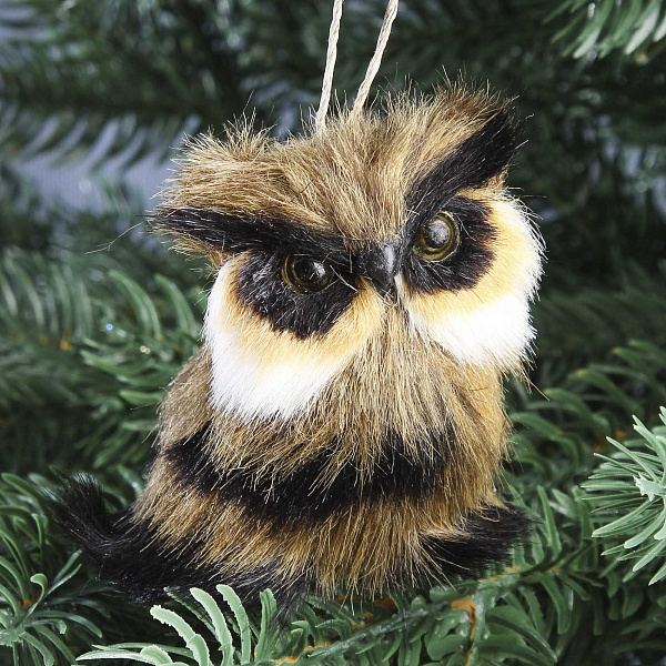Филин украшен мягкими перьями, которые добавляют объем и натуральность. Глаза фигурки тщательно проработаны, создавая эффект выразительного взгляда, что привлекает внимание и вызывает улыбку.