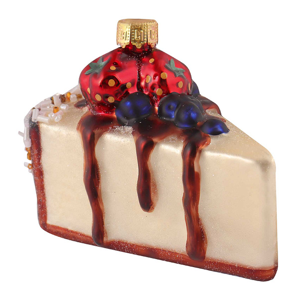 Стеклянная елочная игрушка «Торт» выполнена в классическом стиле и имеет высоту 8 см. Изделие напоминает аппетитный кусочек торта, декорированный яркими деталями.
