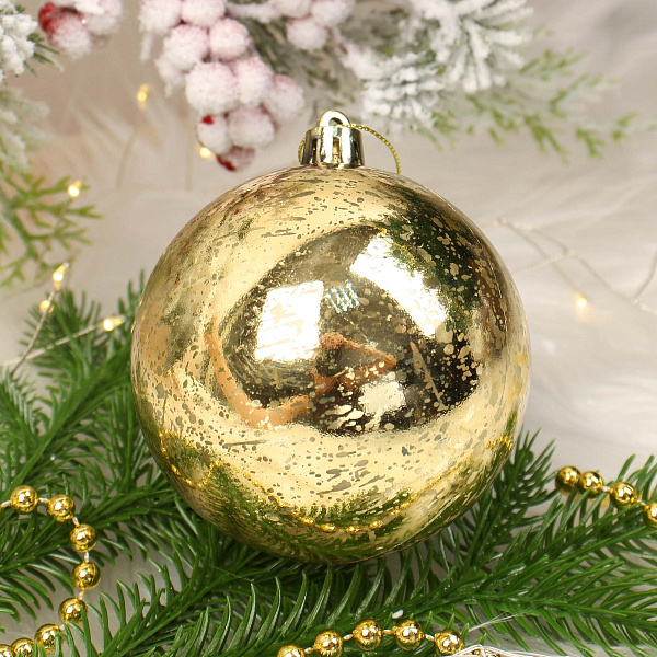 Елочная игрушка шар диаметром 8 см — элегантное декоративное украшение для новогодней елки и праздничного интерьера. Изготовлен из прочного пластика с эффектом состаренного золотистого покрытия, создающего атмосферу винтажного стиля и нежного блеска.