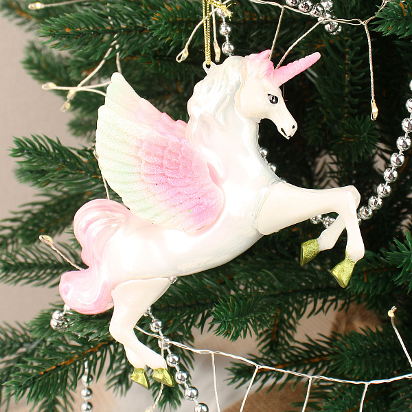 Елочная игрушка «Единорог» выполнена из стекла и украшена нежными нежно-белыми и розовыми оттенками. Размер игрушки составляет 13 см. Игрушка подвешивается на новогоднюю елку за золотистую нить. Она станет ярким элементом декора. Материал и аккуратное выполнение деталей обращают на себя внимание и создают атмосферу праздника.