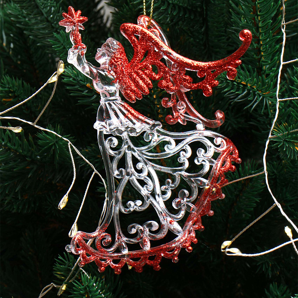 Елочное украшение Ангел прозрачное с красным глиттером 12,5см