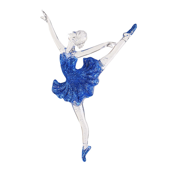Элегантное елочное украшение выполнено в виде балерины, изготовлено из прозрачного пластика. В синем наряде оно эффектно выделяется среди других украшений на новогодней елке. Высота изделия составляет 15 см, что придает изящества и воздушности композиции.