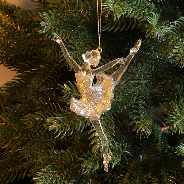 Декоративное украшение «Балерина» высотой 15 см выполнено из прозрачного пластика, дополненного серебристыми деталями. Изящная фигура танцовщицы станет стильным элементом в праздничном декоре.