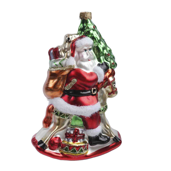 Новогоднее классическое украшение в виде фигурки Деда Мороза на лошади, выполненное из стекла высотой 12 см. Фигурка Деда Мороза в традиционном красном костюме с белой опушкой, сидящего на золотистой лошади. Композиция дополнена зеленой елкой и подарками, что придает праздничное настроение и атмосферу сказки. Украшение оснащено золотистым шнурком для удобного подвешивания на елку.