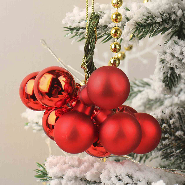 Елочное украшение «Гроздь шаров» выполнено из красного стекла и состоит из нескольких маленьких шариков диаметром 1 см каждый. Шарики имеют глянцевую и матовую поверхности, что создает интересный визуальный эффект. Украшение подвешивается за золотистую нить, что помогает легко разместить его на елке или в другом праздничном декоре.