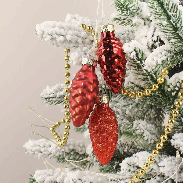 Елочное украшение Гроздь шишек стеклянное красное 3шт 5см