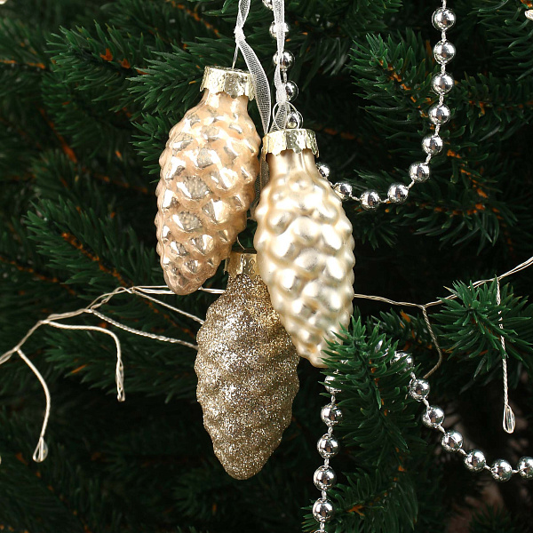 Украшение представляет собой гроздь из трёх стеклянных шишек в стиле лофт, выполненных в жемчужной цветовой гамме. Каждый элемент отличается оригинальной текстурой: одна шишка покрыта матовым покрытием, вторая — глянцевая с перламутровым блеском, третья украшена блестками, что создает имитацию инея. Высота каждой шишки составляет 5 см, что делает композицию компактной и изящной. Шишки собраны на белую декоративную ленту с петелькой для удобного подвешивания на ёлку или в интерьерную композицию.