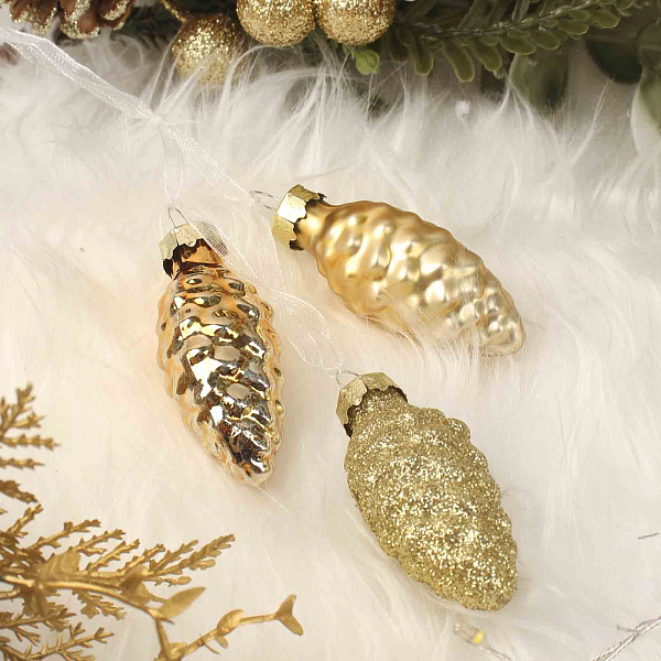 Украшение представляет собой гроздь из трёх стеклянных шишек в стиле лофт, выполненных в золотой цветовой гамме. Каждый элемент отличается оригинальной текстурой: одна шишка покрыта матовым покрытием, вторая — глянцевая с перламутровым блеском, третья украшена блестками. Высота каждой шишки составляет 5 см, что делает композицию компактной и изящной. Шишки собраны на белую декоративную ленту с петелькой для удобного подвешивания на ёлку или в интерьерную композицию.