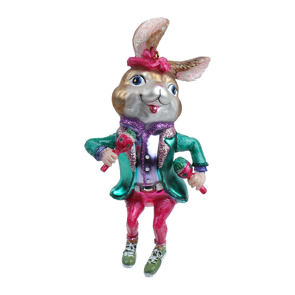 Елочное украшение Кролик-певец в ярком костюме стекло 13см