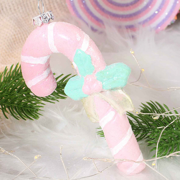 Елочное украшение в виде леденца-трости выполнено в нежно-розовом цвете. Размер изделия составляет 12 см, что делает его заметным на елке. Украшение изготовлено из пластика, благодаря чему отличается легким весом и прочностью. Декор украшения дополнен зелеными листьями и ягодами, что добавляет декоративности и праздничного настроения. К верхней части крепится металлическая петелька с нитью для удобного развешивания.