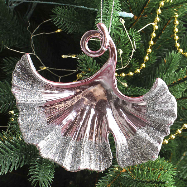 Елочное украшение в форме листа гинкго выполнено в розовом цвете. Сделано из полупрозрачного пластика с серебристыми блестками на краях. Размер украшения — 12 см. Есть ниточка для подвешивания на елку или другие новогодние композиции. Украшение ярко смотрится и добавляет необычный акцент в праздничный декор.