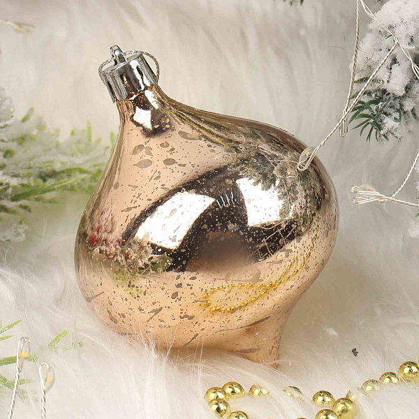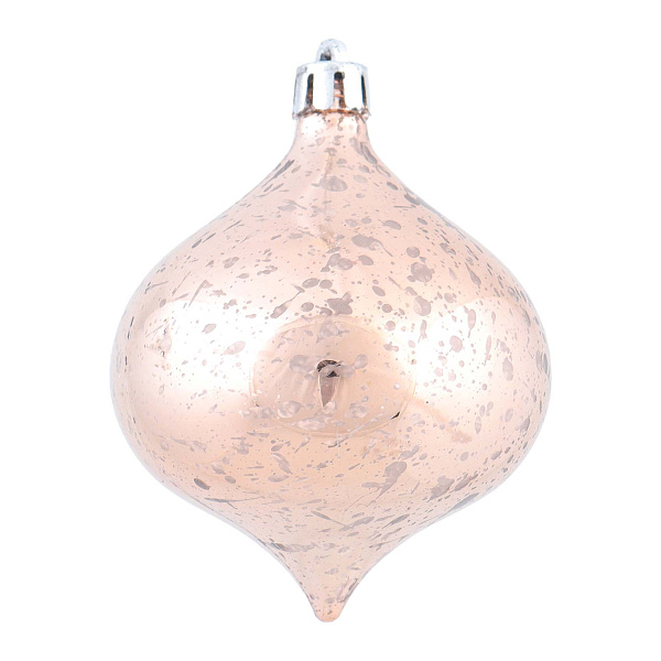 Елочное украшение в виде форме луковицы выполнено из пластика в винтажном стиле. Изделие имеет нежный розовый цвет с эффектом состаренного покрытия, который придает украшению особый шарм и ретро-атмосферу. Высота украшения составляет 9 см, что делает его удобным и заметным элементом праздничного декора. Украшение оснащено металлическим колпачком и золотистой ниткой для подвешивания на елку.