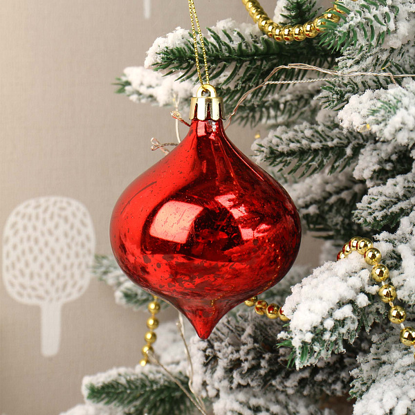 Елочное украшение в форме луковицы выполнено из пластика в винтажном стиле. Изделие имеет насыщенный красный цвет с эффектом состаренного покрытия, который придает украшению особый шарм и ретро-атмосферу. Высота украшения составляет 9 см, что делает его удобным и заметным элементом праздничного декора. Украшение оснащено металлическим колпачком и золотистой ниткой для подвешивания на елку.
