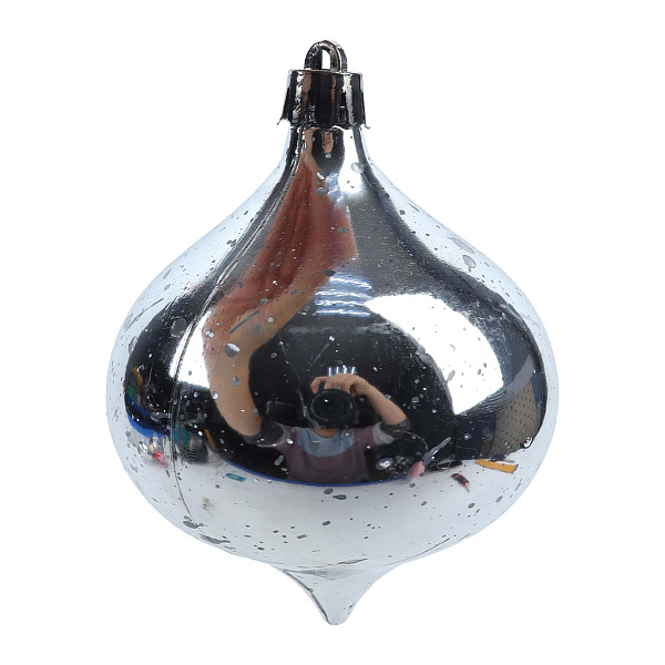 Елочное украшение выполнено в форме луковицы в винтажном стиле. Изготовлено из пластика с эффектом состаренного серебра, что придает изделию необычный внешний вид. Размер игрушки составляет 9 см, что делает ее заметной на новогодней елке. Украшение легко вешается на ветку благодаря металлической петельке с ниткой.