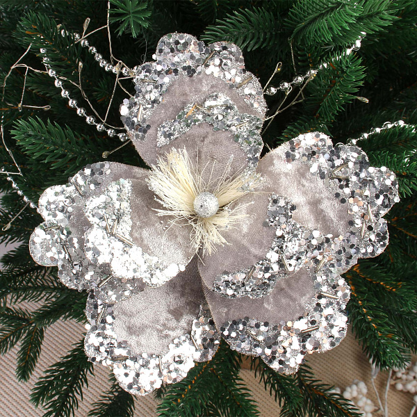 Елочное украшение Мак велюровое с пайетками винтажное на прищепке серебро 20см