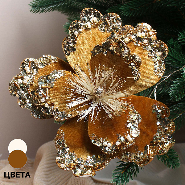 Украшение елочное Мак велюровое с пайетками винтажное золотое 20см в ассортименте