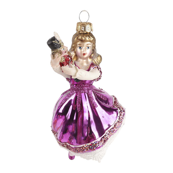 Елочное украшение «Маша и Щелкунчик» выполнено из стекла, что придает изделию изысканный блеск. Композиция представляет собой фигурку героини сказки Гофмана. Волосы девушки плавно струятся по плечам. Маша бережно держит в руках Щелкунчика. Каждая деталь тщательно проработана: от выразительных черт лица до мелких элементов одежды.