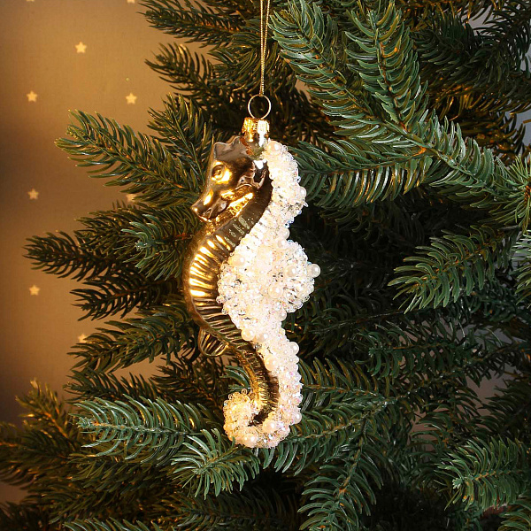Елочная игрушка в форме морского конька выполнена из стекла с золотым покрытием, что добавляет ей изысканный и эффектный вид. Высота изделия составляет 15 см, украшение декорировано блестящими элементами, которые имитируют морскую пену, добавляя оригинальность и блеск.