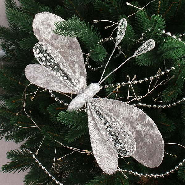 Украшение для елки — изящный винтажный мотылек длиной 12 см в серебряном оттенке с бархатистой текстурой (велюр). Нежные крылья украшены прозрачной тканью с блестящими элементами, придавая изделию особое очарование и праздничное сияние. Благодаря удобной заколке на обратной стороне, мотылек легко крепится к веткам елки или другим декоративным элементам, добавляя интерьеру элегантности и изысканности.