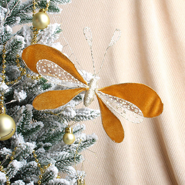 Украшение для елки — изящный винтажный мотылёк длиной 12 см в золотистом оттенке с бархатистой текстурой (велюр). Нежные крылья украшены прозрачной тканью с блестящими элементами, придавая изделию особое очарование и праздничное сияние. Благодаря удобной заколке на обратной стороне, мотылек легко крепится к веткам елки или другим декоративным элементам, добавляя интерьеру элегантности и изысканности.