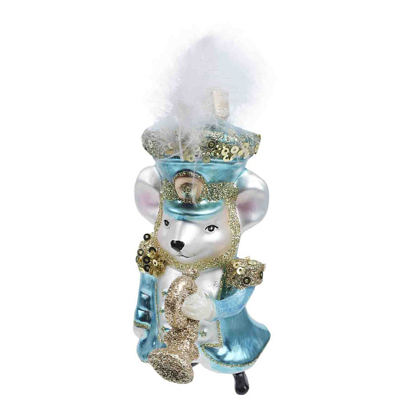 Елочное украшение в виде мыши выполнено из стекла и окрашено в голубые и золотистые оттенки. Высота изделия составляет 13 см. Мышь изображена в костюме с блестящими деталями, украшена белыми пушистыми перьями на шляпе. Украшение подвешивается на тонкой золотистой нити.