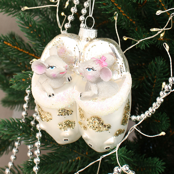 Украшение имеет металлическое колечко с ниткой для подвешивания. Форма украшения напоминает объятия двух мышат, что добавляет изделию очарования. Такая игрушка станет ярким акцентом в праздничном декоре.