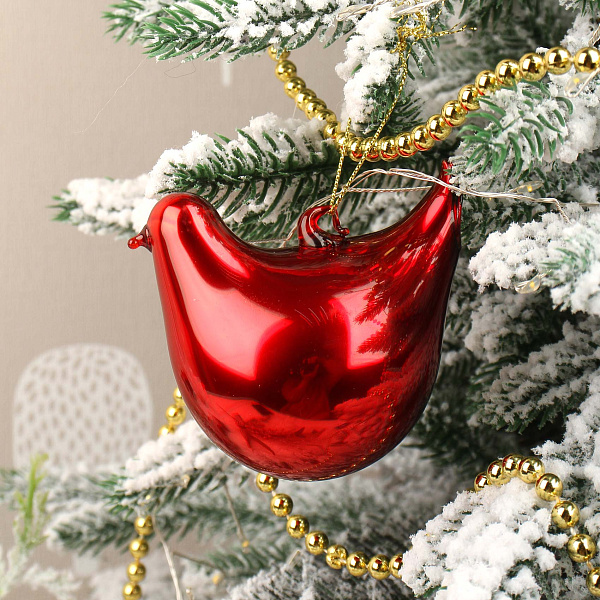 Елочное украшение в форме птицы выполнено из стекла с ярким красным глянцевым покрытием в стиле лофт. Изделие отличается плавными формами и гладкой поверхностью, придающей ему современный и элегантный вид. Длина украшения составляет 7 см, что делает его компактным и заметным акцентом на праздничной елке. Украшение оснащено золотистой ниткой для удобного подвешивания.