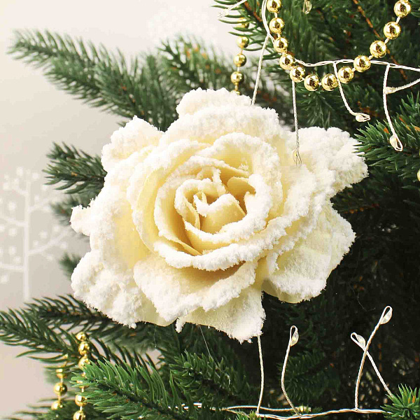 Украшение в виде белой розы выполнено в винтажном стиле с эффектом белого инея, что придаёт цветку изысканную зимнюю свежесть и нежность. Диаметром 9 см, цветок изготовлен из пластика с детальной проработкой лепестков и текстильных элементов, создающих реалистичный образ. На обратной стороне установлен металлический зажим-клипса, позволяющий удобно закрепить розу на одежде, ёлочных ветках или других декоративных композициях.