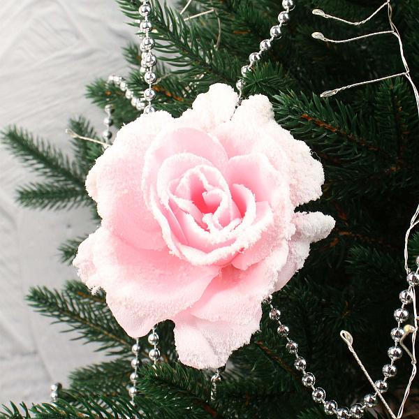 Украшение в виде розовой розы выполнено в винтажном стиле с эффектом белого инея, что придаёт цветку изысканную зимнюю свежесть и нежность. Диаметром 9 см, цветок изготовлен из пластика с детальной проработкой лепестков и текстильных элементов, создающих реалистичный образ. На обратной стороне установлен металлический зажим-клипса, позволяющий удобно закрепить розу на одежде, ёлочных ветках или других декоративных композициях.