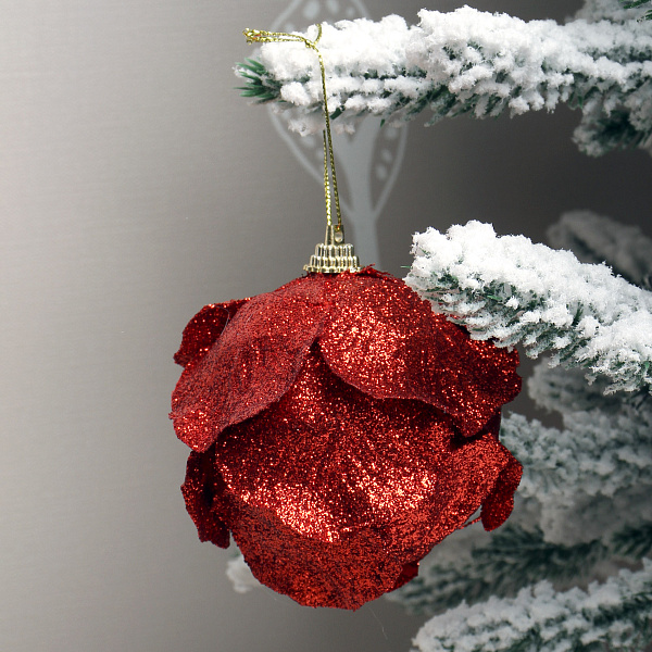 Елочная игрушка — украшение с оригинальным дизайном в форме розы красного цвета диаметром 8 см. Изящные лепестки, покрытые блестящим глиттером, придают шарику утонченность и праздничное сияние. Этот декоративный элемент станет стильным и ярким акцентом на новогодней елке, создавая атмосферу изящества и тепла.