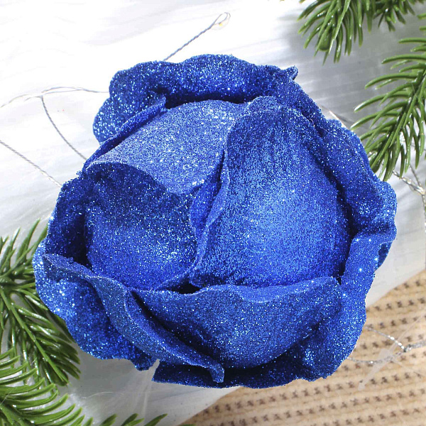 Елочное украшение выполнено в форме розы насыщенного синего цвета. Поверхность изделия покрыта блестящими частичками, которые создают яркий эффект. Изделие сделано из пластика и текстиля, что придает ему легкость и аккуратный внешний вид. Диаметр шара составляет 8 см. Украшение оснащено металлической петелькой и нитью для крепления на ветки.