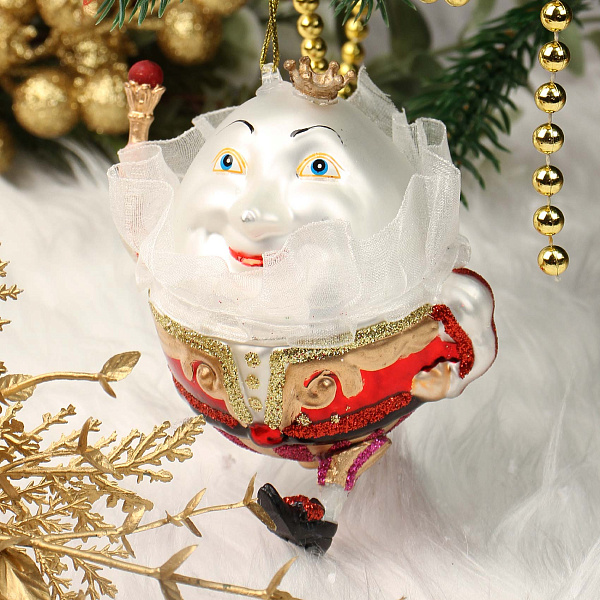 Новогоднее украшение в классическом стиле «Шалтай-Болтай» в виде изящной стеклянной фигурки высотой 11 см. Фигурка выполнена в образе забавного персонажа сказки с выразительным белым лицом, голубыми глазами и маленькой короной на голове. Украшена нежной прозрачной тканью и яркими декоративными элементами в красных, золотистых и фиолетовых тонах, что придает изделию сказочную и праздничную атмосферу. Украшение оснащено тонкой петелькой для удобного подвешивания на елку или ветку, добавляя аутентичный акцент в новогодний декор.