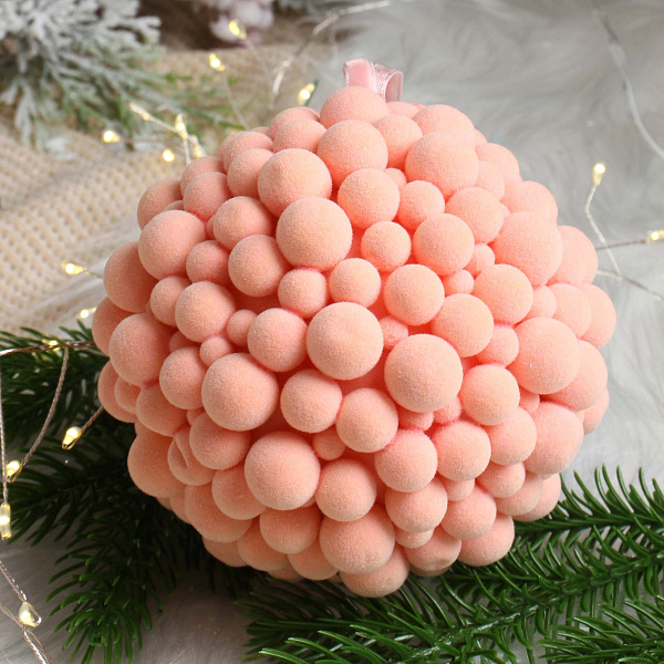 Елочный шар диаметром 10 см выполнен в нежном розовом цвете. Поверхность украшена множеством мелких пушистых шариков, создающих необычный эффект. Изделие висит на ленте такого же оттенка, что позволяет легко разместить его на елке или подвесить в интерьере. Шар станет оригинальным дополнением к другим украшениям и подарит настроение тепла и радости.