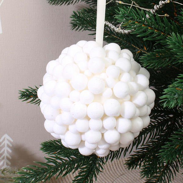 Елочная игрушка в виде шара выполнена из пластика с матовым покрытием в белом цвете, оформленная в стиле хюгге — уют и тепло. Игрушка покрыта небольшими бархатистыми шариками, придающими ей интересную фактуру и мягкий визуальный эффект. Диаметр изделия составляет 10 см, что делает ее удобной для подвешивания на елку или использование в других праздничных декорациях. Игрушка оснащена ленточкой для легкого и надежного крепления.