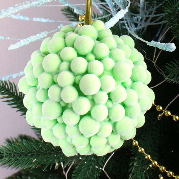 Елочный шар с пушистой поверхностью выполнен в зеленом цвете. Шар украшен множеством небольших объемных элементов, создающих необычную фактуру. Изделие предназначено для украшения новогодней елки или интерьера. Размер изделия составляет 10 см в диаметре.