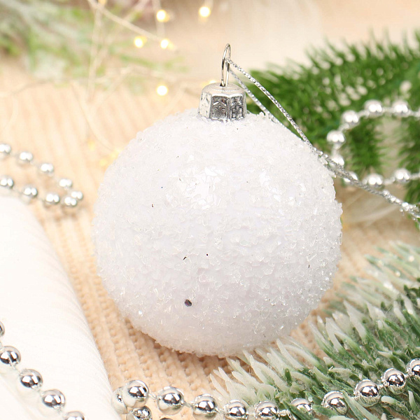 Белый елочный шар в винтажном стиле станет изысканным и атмосферным дополнением праздничного декора. Изготовленный из прочного пластика, шар покрыт имитацией мелких кристаллов и граненых частиц, создающих завораживающий эффект снежного ледяного покрытия. Такая текстурированная поверхность придает украшению особую глубину и мерцание, наполняя интерьер зимней свежестью и сказочной магией.