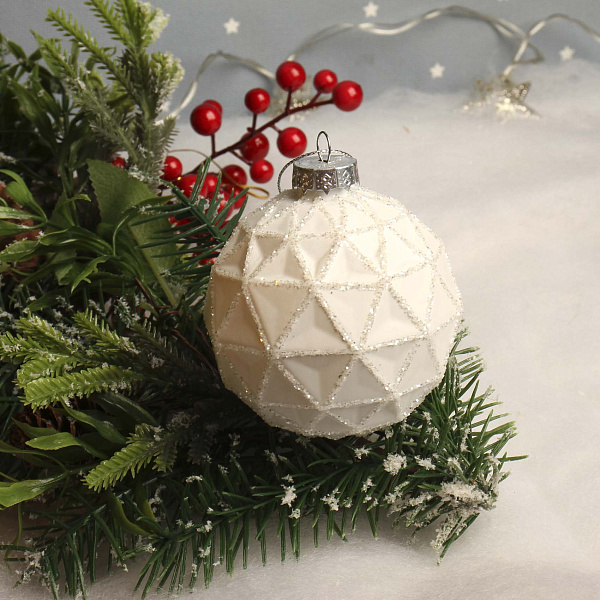 Матовый елочный шар с рельефным декором станет идеальным украшением новогодней елки. Изготовлен из стекла и покрыт белой матовой краской, что придает ему изысканный и стильный вид. На выпуклых частях шара нанесены блестки, которые создают легкий мерцающий эффект, добавляя праздничного сияния.