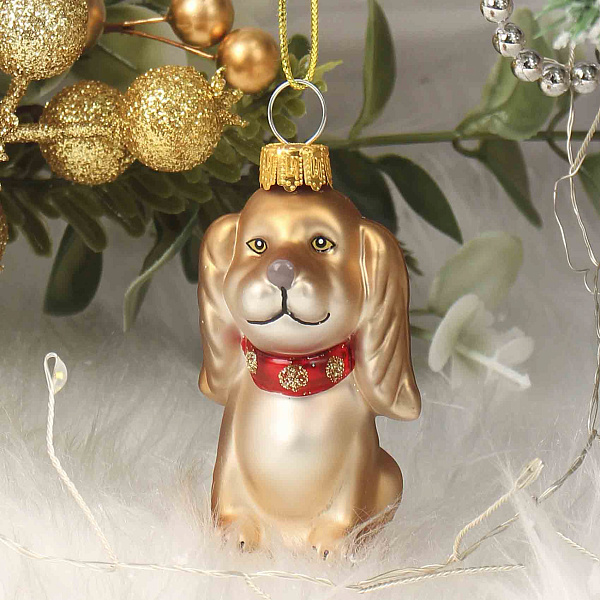 Новогоднее классическое украшение в виде милой фигурки собачки, выполненное из стекла высотой 7 см. Фигурка изображает сидящую собачку с выразительными глазами и ухоженной шерстью в коричневых и бежевых тонах. Живой и добрый образ дополнен красным ошейником с декоративными элементами, что придает изделию праздничный и уютный вид. Украшение оснащено золотистым шнурком для удобного подвешивания на елку.