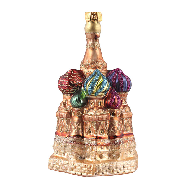 Украшение для новогодней елки изготовлено из стекла и поражает детальным исполнением. Высота изделия составляет 14 см, что делает его заметным элементом праздничного декора. Богатство деталей и насыщенные цвета создают впечатление маленького архитектурного шедевра.