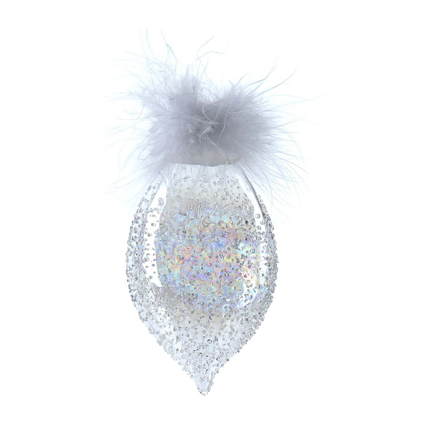 Елочное украшение в виде прозрачной сосульки выполнено из стекла и украшено текстурой в виде капель, создающей эффект инея и льда. Верхушка изделия декорирована мягким белым пером, придающим легкость и воздушность образу. Диаметр сосульки составляет 13 см, что делает ее заметным и изящным элементом праздничного декора. Украшение идеально впишется в стиль лофт и добавит естественную атмосферу зимнего праздника.