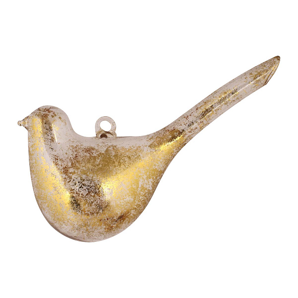 Стильное украшение для елки в форме изящной птички гармонично впишется в современные минималистические интерьеры. Золотистые мазки на прозрачной основе создают эффект винтажной игрушки.
