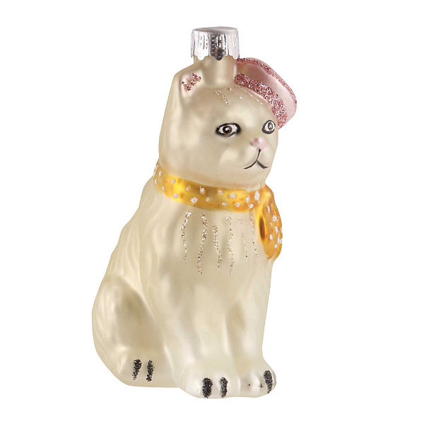 Елочное украшение Кошка в берете и желтым шарфом бежевая 7,5см