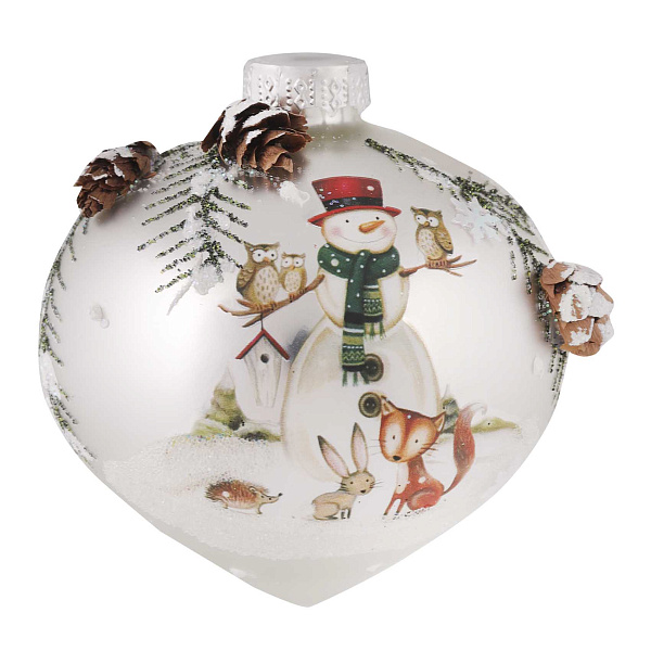 Новогоднее украшение для елки подчеркнет праздничную атмосферу. Серебристая фигурка украшена изящной росписью с изображением снеговика и лесных животных. Сверху она декорирована миниатюрными шишками, придающими изделию шарм зимнего леса. Металлическая серебристая петля обеспечивает надежное крепление к елочной ветке.